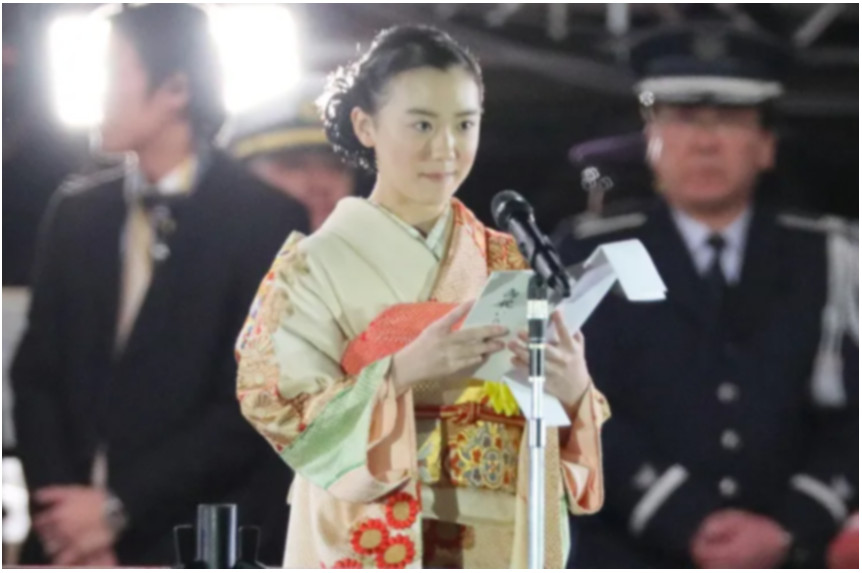 それは2019年11月9日、彼女がまだ15歳(中学3年生)だった頃のことです。皇居前広場で行われた『天皇陛下御即位をお祝いする国民祭典』に艶やかな着物姿で登壇し、約2分半にわたって立派な祝辞を述べたのです。